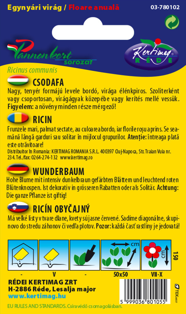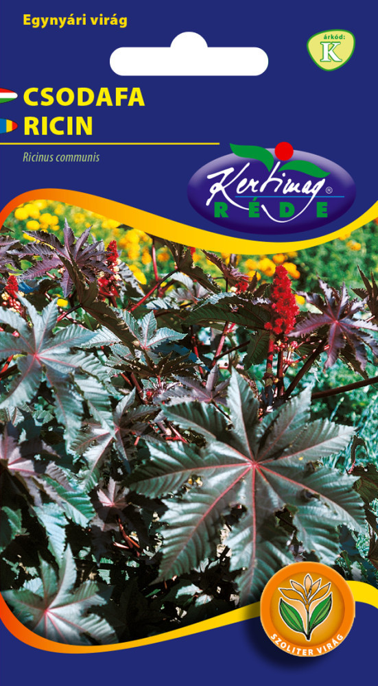 Nagy, ujjasan osztott levelű, 150-200 cm magas, egynyári növény. Elsősorban leveleivel díszít. A levél bordó, fürtös virágai jelentéktelenek, sárgák, termése tüskés tok, ami pirosra színeződik. Április végén vetjük állandó helyére, fészekbe. Mélyrétegű, tápanyagban gazdag talajban, rendszeresen öntözve hatalmas termetűre fejlődik. Nagyobb gyepfelületekre csoportosan vagy egyenként ültethetjük, falak, járdák, kerítések mellett cserjepótlónak, takarónövénynek is kiváló. Magja erősen mérgező!