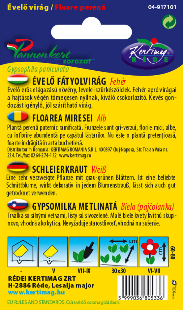 Hazánkban is honos, 60-100 cm-re növő, erős elágazású növény. Szürkészöld levelei lándzsásak, fehér apró virágai a hajtások végén tömegesen nyílnak. Fátyolszerű, könnyed virágzatai igen hatásos csokorlazítók. A vetést ne takarjuk, a csírázáshoz fényt igényel. Végleges helyére szeptemberben ültetjük. Mélyrétegű, jó vízáteresztő talajt kíván. Elsősorban vágott virág, de szoliterként szabad évelőcsoportokba vagy sziklakertbe ültetve is dekoratív.