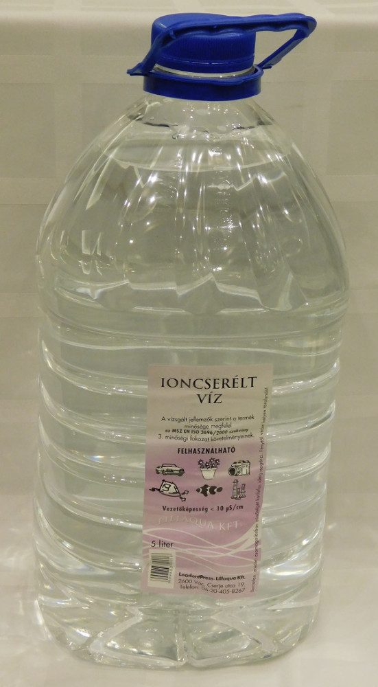 Korszerű ioncserélő eljárással tisztított víz, 5 litereskiszerelésben.