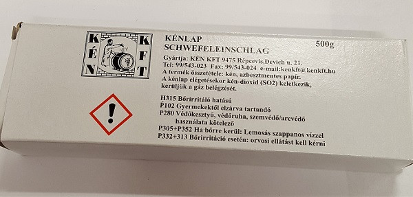 A kénlap egy szeletje 1 hl űrtartalmú hordó kénezéséhezelegendő. A hordó űrtartalmának figyelembevételével válassza ki a megfelelőmennyiséget (szükség esetén a szelet eltörhető). A kénlapot tűzze fel egydrótdarabra (rézdrót kerülendő). Az így elkészített egységet a szeletektetejénél gyufával vagy öngyújtóval gyújtsa meg, a kén halvány lánggal ég. Ezta mennyiséget helyezze a hordó szájába, majd dugja a dugót a hordóba és a drótvégét fordítsa a hordóra. 24 óra elteltével emelje ki a drótot a hordóból,ügyelve arra, hogy a szeletek maradványai egyben maradjanak.