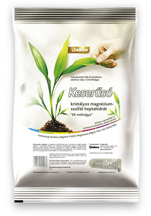 Felhasználás, adagolás: A magnézium klorofill képző elem. Anövények a talajból kevésbé képesek a magnéziumot felvenni, így elsősorban levéltrágyakéntjavasolt a felhasználása. Általános adagja oldatként: Repcébenvirágzásig 5%, egyéb szántóföldi kultúrákban 5%, burgonyában termésképzéskor5%, gyümölcsösben termésképzéskor 1-2%, szőlőben virágzás után 3-4%,zöldségeknél terméskötődéstől 1-2%, dísznövényeknél 2-3%.