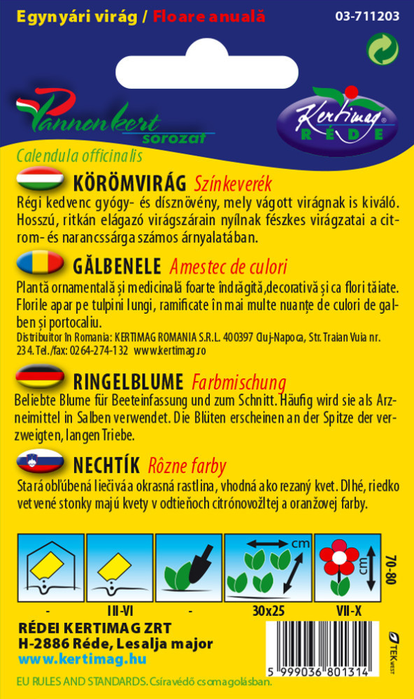 Régi kedvenc gyógy- és dísznövény. Vágott virágnak is kiváló. Laza középkötött közepes tápanyagtartalmú talajt igényel. A talajt ne takarjuk mivel fényre csírázik. Féltelt virágai a sárga szín különböző árnyalataiban nyílnak. A folyamatos nyílás érdekében szedjük le az elnyílott virágokat.