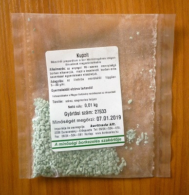 A Kupzit új fejlesztésű rézcitrát preparátum a bor, agyümölcsbor, valamint más erjedési termékek kénhidrogén szag (bakszag) jellegűillathibáinak eltávolítására. A Kupzit 2% rézcitrátot tartalmaz, és a könnyűadagolás és kezelés érdekében ásványi hordozóanyagra, tiszta, értékes bentonitravitték fel, és granulálták.