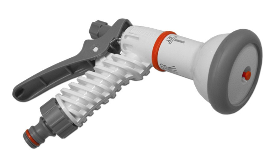 Könnyen „tárcsázható”, 3 mintázatú locsolópisztoly, tenyérbeilleszkedő markolattal, állítható ravasszal.