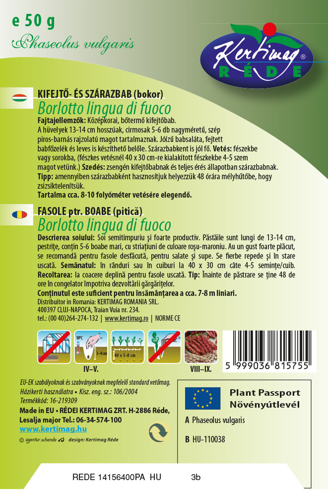 Középkorai, bőtermő kifejtőbab. A hüvelyek 13-14 cm hosszúak, cirmosak, 5-6 db nagyméretű, szép piros-barnás rajzolatú magot tartalmaznak. Jóízű babsaláta, fejtett babfőzelék és leves is készíthető belőle.