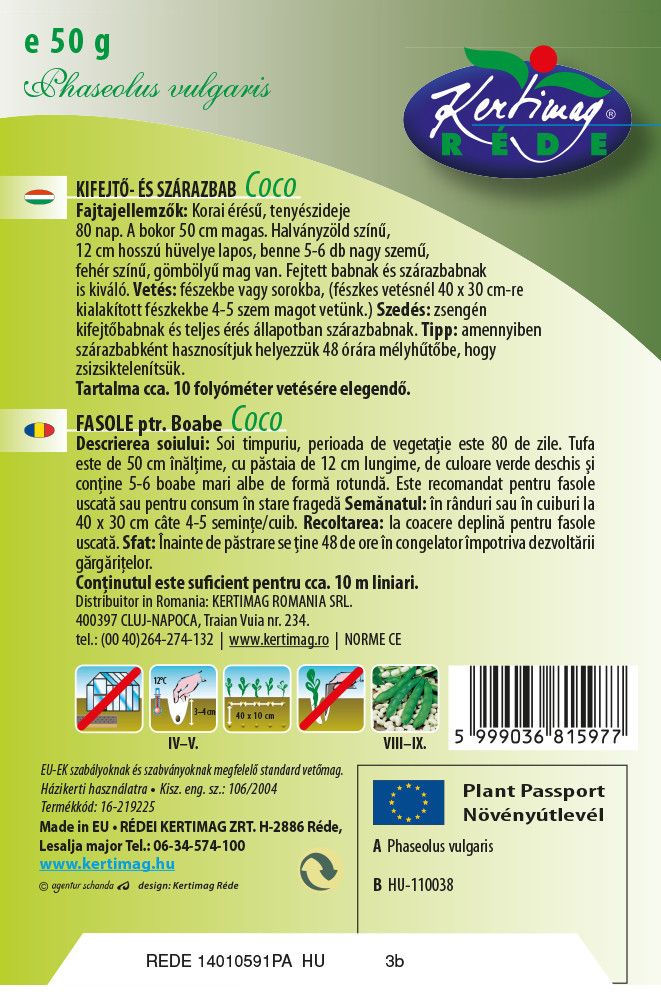 Korai érésű, tenyészideje 80 nap. A bokor 50 cm magas. Halványzöld színű, 12 cm hosszú hüvelye lapos, benne 5-6 db nagy szemű, fehér színű, gömbölyű mag van. Fejtett babnak és szárazbabnak is kiváló.