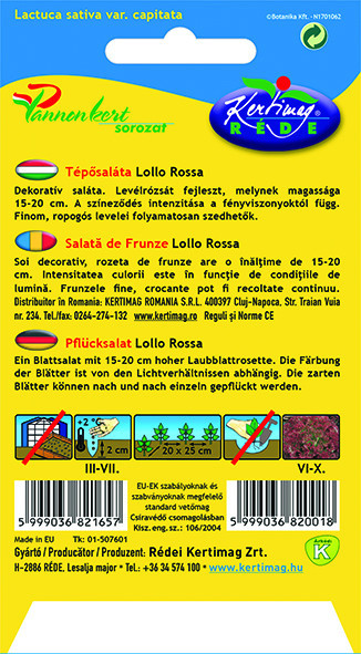 Szakaszosan egész évben vethető. Levélrózsát fejleszt, melynek magassága 15-20cm fodros, sárgászöldes levelekkel, melyek piros szegélyben végződnek. Levelei folyamatosan szedhetők. A színeződés intenzitása a fényvisonyoktól függ. Finom, ropogós levelei folyamatosan szedhetőek.