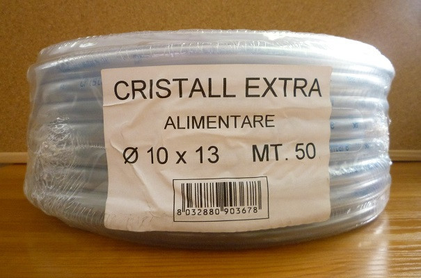 Cristal /olasz/ víztiszta műszaki tömlő 50 folyóméterestekercsben, élelmiszeripari minősítéssel.