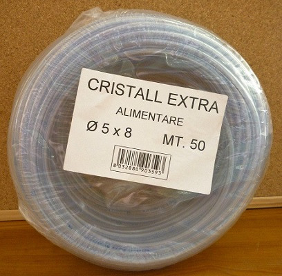 Cristal /olasz/ víztiszta műszaki tömlő 50 folyóméterestekercsben, élelmiszeripari minősítéssel.