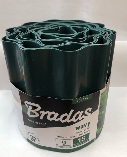 15 cm magas, 9 méter hosszú hullámos, műanyag gyepszegély,sötétzöld színben.