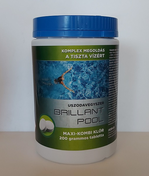 Maxi-kombi klórtabletta, 90% klórtartalommal, algaölő éspelyhesítő adalékkal, triklórizocianursav hatóanyaggal, lassan oldódó 200 g-ostabletta.