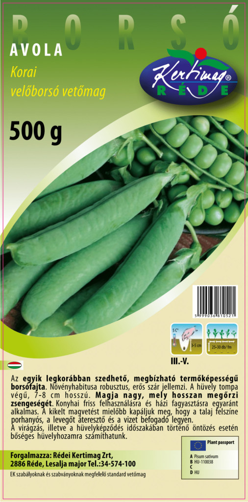 Az egyik legkorábban szedhető, megbízható termőképességű borsófajta. Növényhabitusa robosztus, erős szár jellemzi.A hüvely tompa végű, 7-8 cm hosszú. Magja nagy, mely hosszan megőrzi zsengeségét. Konyhai friss felhasználásra és házi fagyasztásra egyaránt alkalmas. A kikelt magvetést mielőbb kapáljuk meg, hogy a talaj felszíne porhanyós, a levegőt áteresztő és vizet befogadó legyen. A virágzás, illetve a hüvelyképződés időszakában történő öntözés esetén bőséges hüvelyhozamra számíthatunk.